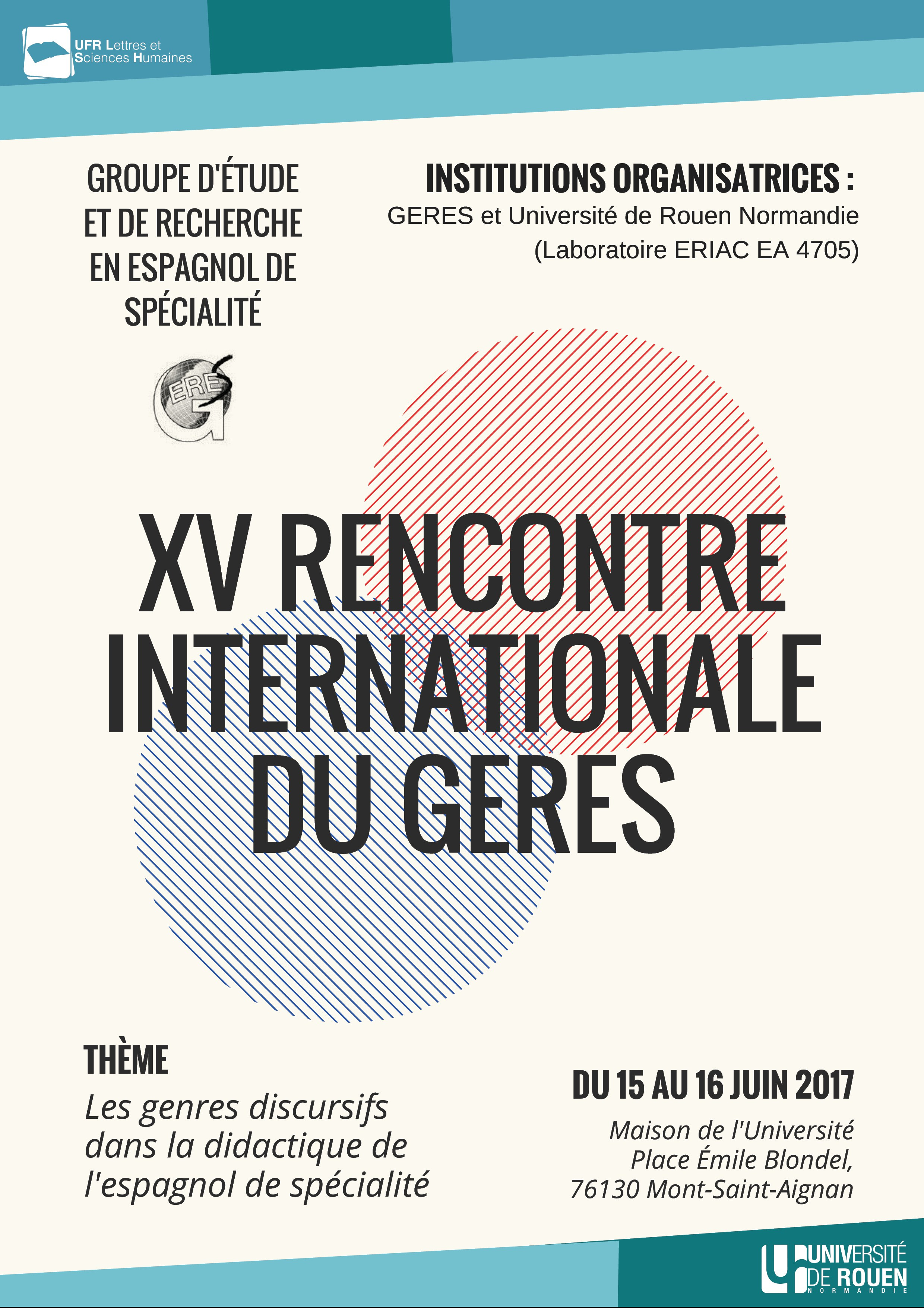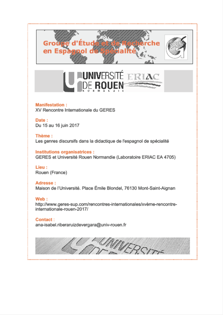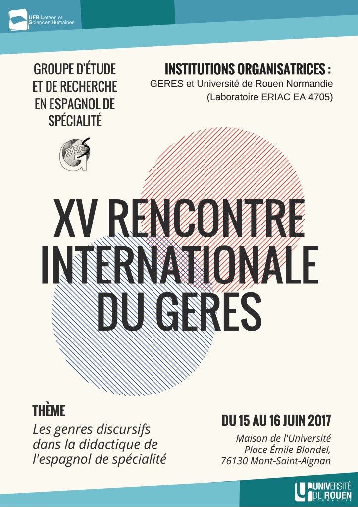 Publié : 12/06/2017 Classé dans : Didactique | Tags: Affiches, Colloque, Didactique, Education, Langue, Programme Commentaires fermés sur XV Encuentro Internacional del GERESEl XV Encuentro Internacional del GERES se celebrará en la Universidad de Rouen Normandie los próximos días 15 y 16 de junio de 2017.