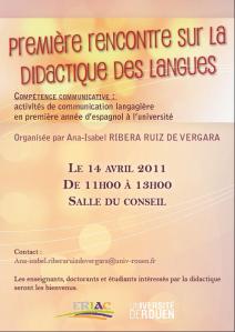 Une première rencontre sur la Didactiques des Langues, au sein du Département d’Etudes Romanes et en collaboration avec le laboratoire de recherche ERIAC de l’Université de Rouen, intitulée Compétence communicative : activités de communication langagière en première année d’espagnol à l’université, a eu lieu le 14 avril 2011 à l’Université de Rouen.