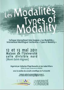 Un colloque international sur Les Modalités / Types of Modality, organisé au sein du laboratoire de recherche ERIAC de l’Université de Rouen, a eu lieu les 12 et 13 mai 2011 à l’Université de Rouen.